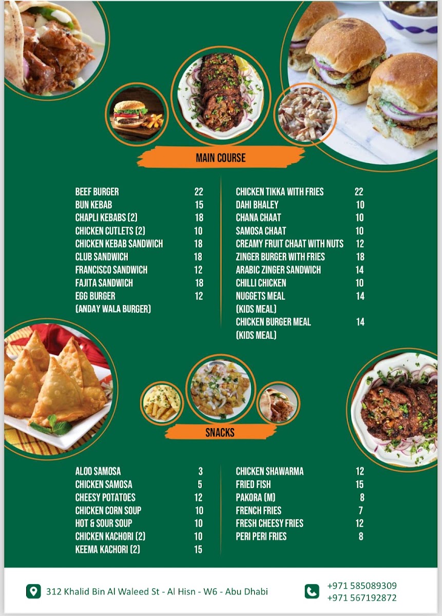 The menu boasts an array of snacks like the Aloo Samosa at just AED 3.00 and Chapli Kebabs for AED 18.00, each prepared using fresh ingredients. The Bun Kebab stands out as a Karachi-style favorite, encapsulating the heart of street food culture.
